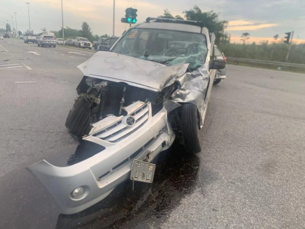 这起事故10日早6时许发生在新捷道红绿灯处。初步了解,轿车从杜当方向驶来,准备右转进入交叉路口时,遭一辆直行的丰田皮卡从左侧猛力撞上,瞬间发出巨响。