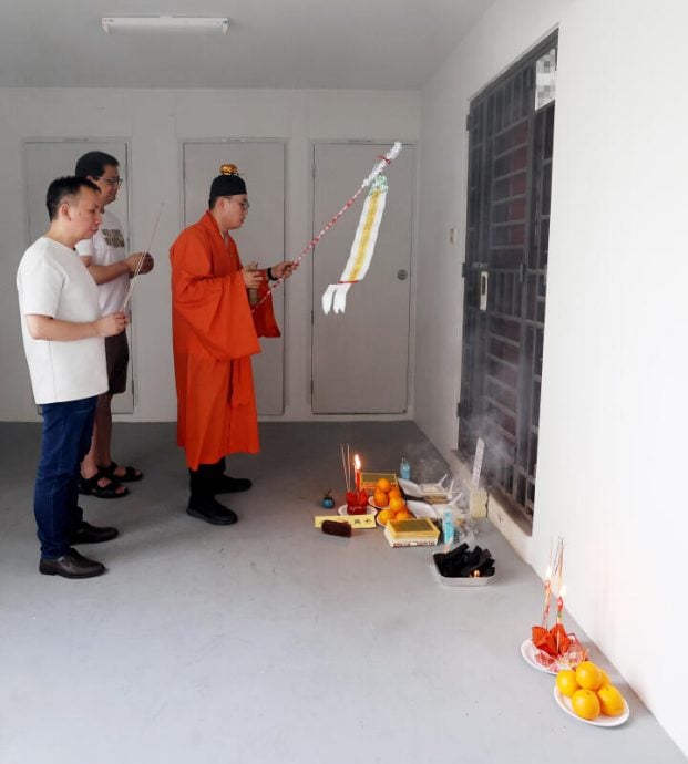 据《新明日报》报道,这场法事由天富宫主办,并邀请显灵道坛陈玟嘉师傅主持。仪式开始后,莫先生与宋先生在师傅指引下焚香祭拜,法师手持招魂幡诵经祈念,随后两人也依照指示,拿着金银纸到楼下焚化,以期引领亡灵归返故土。