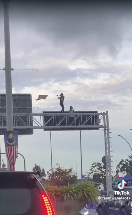 这段视频由网民通过TikTok账号“farahwahida617”上传,只见车流川行不息之际,一名男子已爬上高处狂挥国旗,另一人拿着手机对着他拍摄,场面相当惊人。