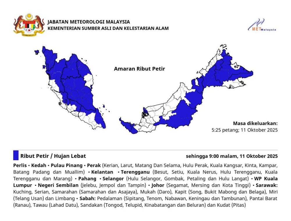 气象局发出最新预报,指出整个马来半岛几乎全面陷入暴风雨天气,多地出现强风与雷雨情况,预计将持续至今晚9时,东马部分地区也难幸免。