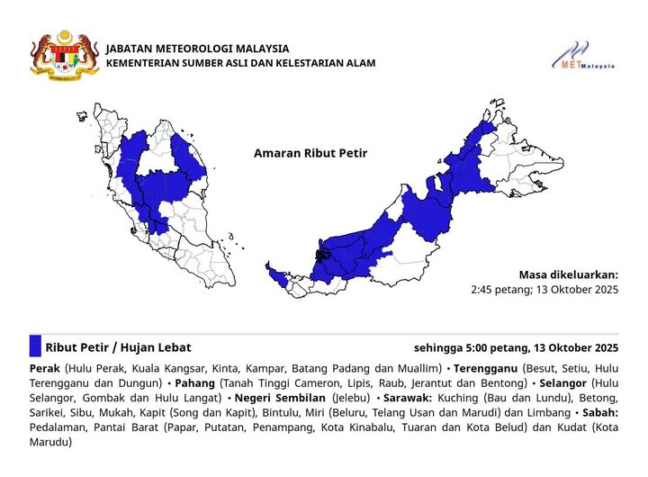 马来西亚气象局发出警告,预计今日(10月13日,星期一)傍晚5时前,多地将出现雷暴、暴雨及强风天气,民众受促提高警惕、避免在恶劣天气外出。