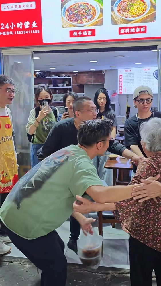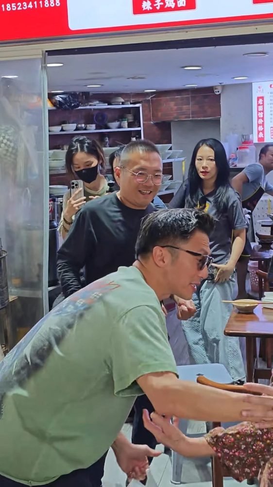 不少网友将偶遇谢霆锋的视频上传至社交平台,其中一个画面更意外曝光了他的暖心举动。影片中,谢霆锋吃完面准备离开时,注意到店外人群中有一位年迈的婆婆。他立刻上前打招呼,并轻握婆婆的手与她聊了几句,还贴心地与她合影留念。婆婆脸上满是笑容,显得十分开心。