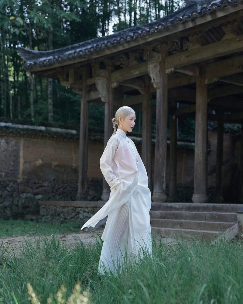 近日,徐娇在社交媒体释出一组个人沙龙照,造型大胆前卫。她以黑、白、红三色为主题,穿上汉服风格的服饰,并漂染银白色头发与眉毛,整体视觉极具艺术感。她表示:“花了三年时间,我终于把脑海里的片段、布料、颜色与气息整理成一个完整的世界,这份沉淀,我取名为——‘不娇造’。”