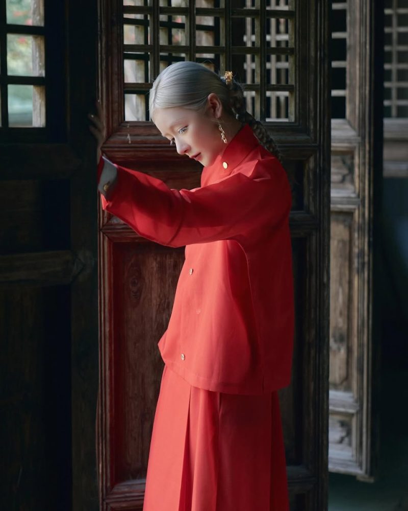近日,徐娇在社交媒体释出一组个人沙龙照,造型大胆前卫。她以黑、白、红三色为主题,穿上汉服风格的服饰,并漂染银白色头发与眉毛,整体视觉极具艺术感。她表示:“花了三年时间,我终于把脑海里的片段、布料、颜色与气息整理成一个完整的世界,这份沉淀,我取名为——‘不娇造’。”