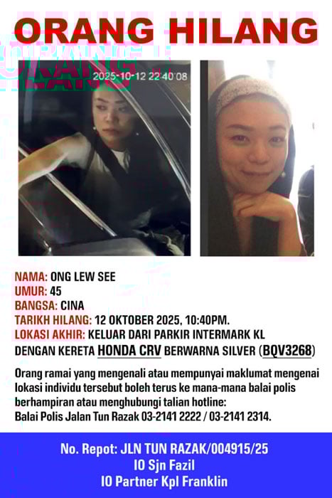 她呼吁公众,若看见该车或掌握王美君行踪,请立即联系她,电话:012-3961111。