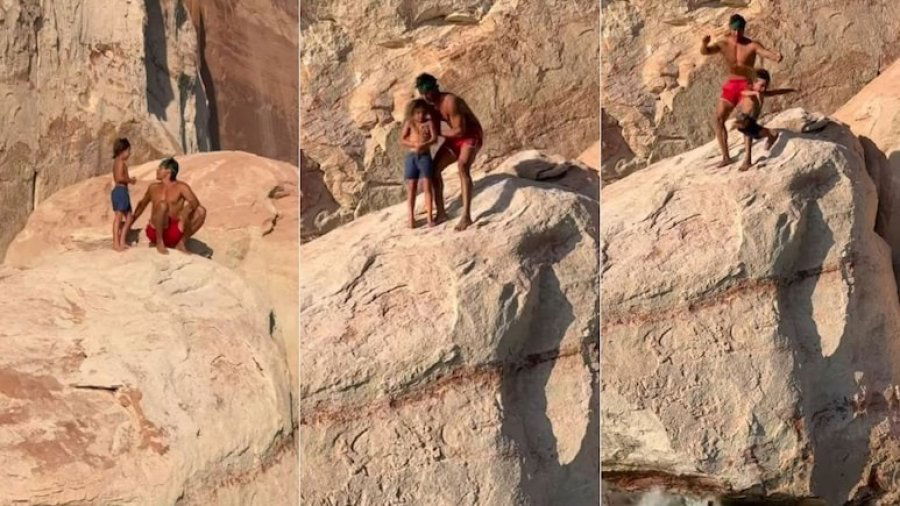 这起事件发生在7月的美国亚利桑那州鲍威尔湖(Lake Powell)。影片中,迦勒特站在高耸的悬崖边,儿子卡利汉(Callihan)紧张得不敢往前一步。几秒犹豫后,父亲忽然一把将他抱起,直接抛进下方的湖水。画面上传后在社交媒体迅速疯传,浏览量破百万,也掀起巨大争论。