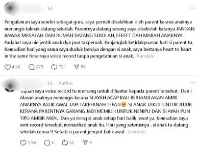 任职教师的爱丽莎娜近日在 Threads 分享这段真实经历。她说,那名家长当时气冲冲来到学校,质问她为何“把家里情绪带到课堂上”,甚至指控她迁怒学生。面对无端的指责,她没有争辩,只是决定亲自了解孩子内心真正的想法。