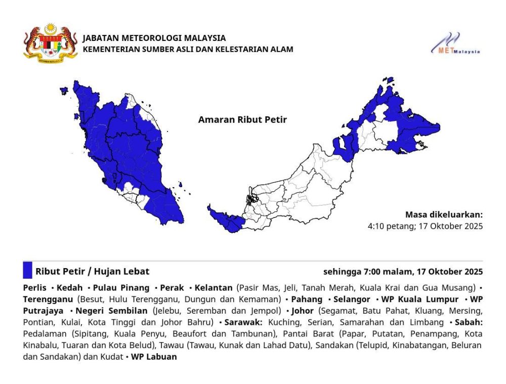 马来西亚气象局于2025年10月17日(星期五)发布雷暴、暴雨及强风预警,预计全国多个州属将在今日下午至傍晚期间遭遇恶劣天气,预警有效至当晚7时。
