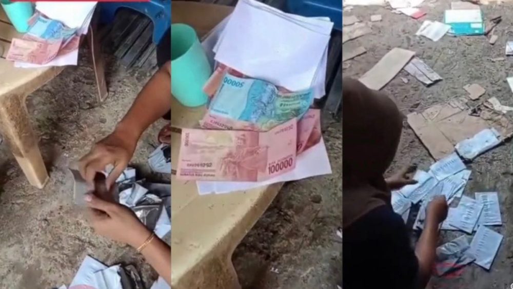 影片中可见,女子蹲在地上不断拾起散落的信封,逐一打开,里面全是印尼盾现钞,面额包括5万印尼盾(约RM13)与10万印尼盾(约RM26)。她一边拆信封、一边难掩惊讶神情。