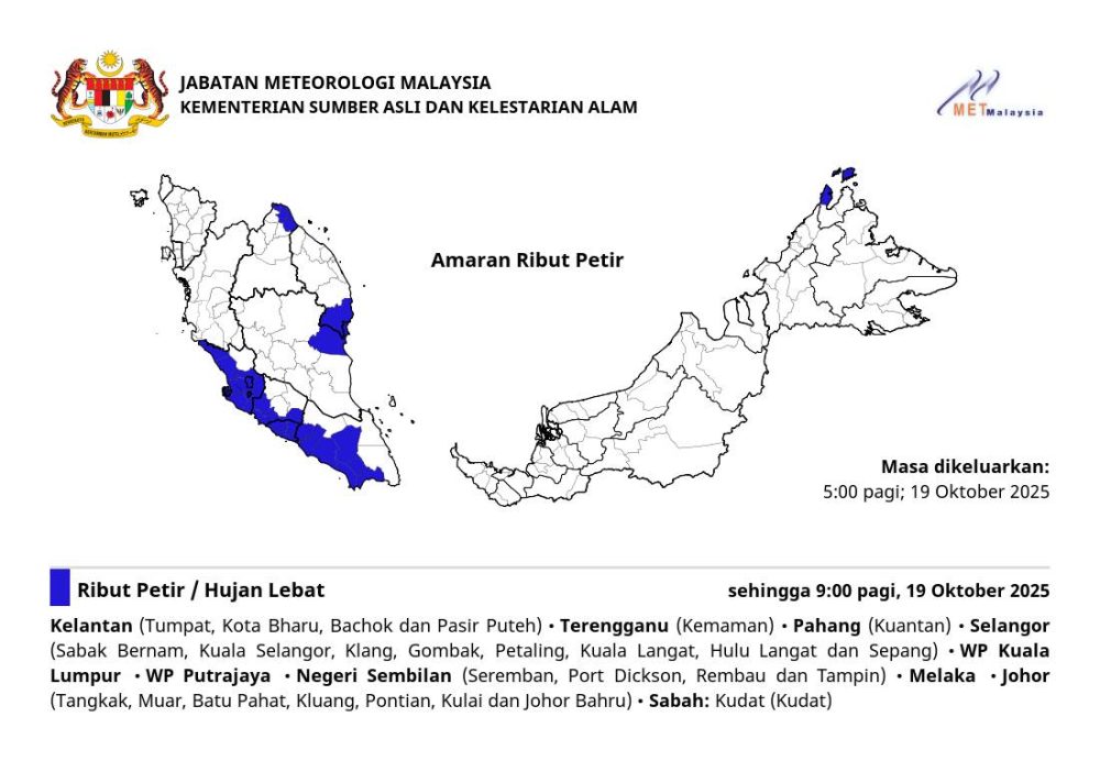 马来西亚气象局今早5时发布短时雷暴预警:多地预计出现雷暴、豪雨与强风,预警有效至今天(周日)上午9时。