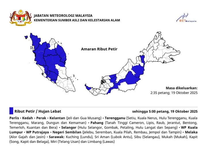 预计霹雳州、吉打州、吉兰丹州(杰里及瓜慕桑)、登嘉楼州(士蒂乌、瓜拉内鲁斯、上登嘉楼、瓜拉登嘉楼、马朗、东根及哥打马曼)、彭亨州(高原金马伦、立卑、劳勿、日兰图、文冬、本同、淡马鲁及比拉)、雪兰莪州(乌鲁雪兰莪、贡巴、八打灵、乌鲁冷岳及雪邦)、联邦直辖区吉隆坡及布城、森美兰州(热鲁布、芙蓉、瓜拉庇劳、林茂、占勿及淡宾)、马六甲州(亚罗牙也及再也欣)以及砂拉越(古晋卢杜、斯里阿曼鲁博安都、泗务森拉高、木胶木胶、卡比特松、卡比特及贝拉加、米里特朗乌桑及林梦劳阿斯)等地将出现雷暴、大雨及强风天气,预报有效至2025年10月19日星期日下午5时。