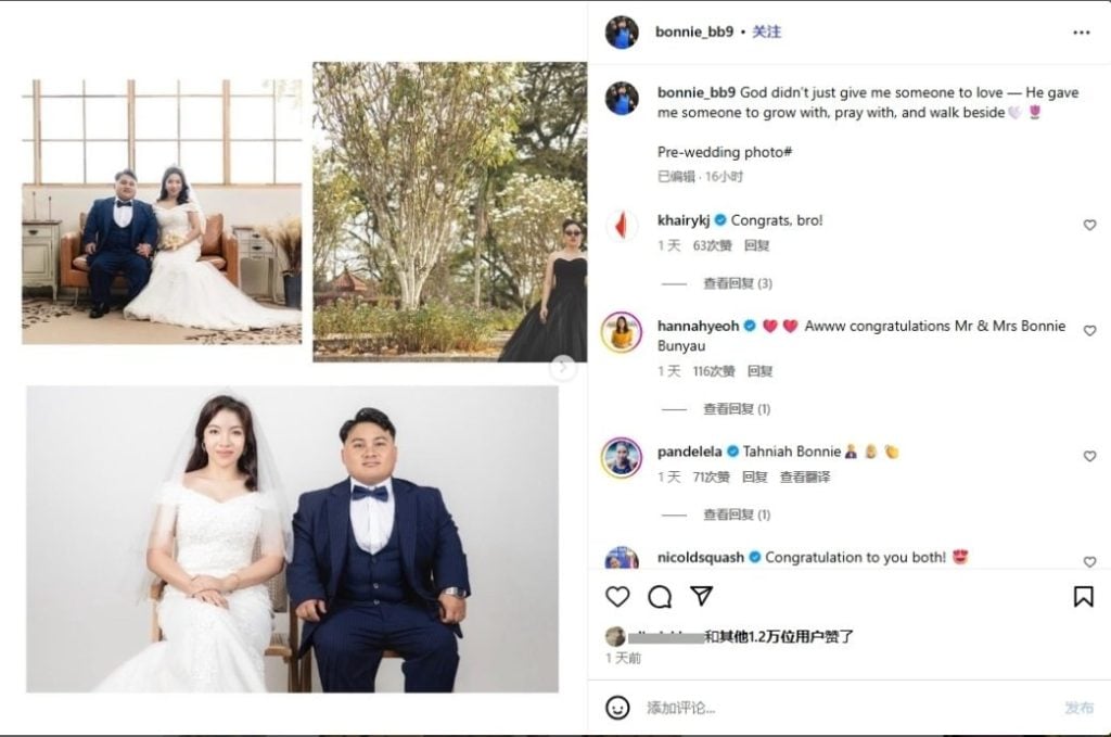 这位26岁的西连健将于Instagram上传多张婚纱照,虽然仅以简短贴文宣布婚讯,却引来网友热烈祝福,短时间内吸引逾1万2000人留言恭贺。其中包括青年及体育部长杨巧双、砂拉越跳水女王拿督潘德莉拉、壁球传奇拿督妮柯·大卫,以及前体育部长凯里等人,纷纷留言祝福这位砂州骄子。