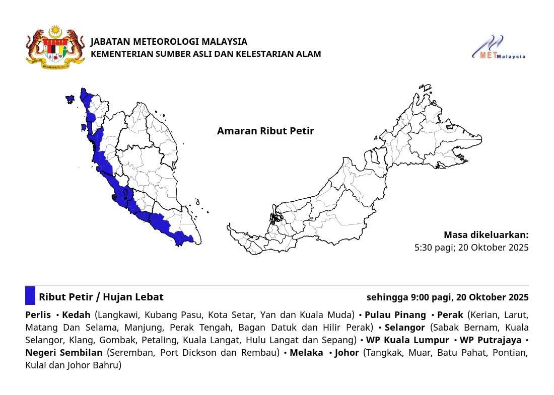 大马气象局今晨发布最新天气预警,指出半岛西海岸多地将出现雷雨及强风天气,预计持续至早上9时,呼吁民众出行时提高警惕。