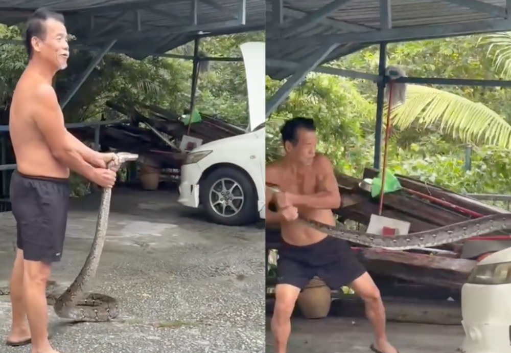 陈先生在社交平台 Threads(@iamvictorchan)上传的视频显示,他的父亲从汽车引擎盖下徒手抓出一条巨大的蟒蛇,双手紧握蛇头防止攻击,随后将蛇放到地上。周围居民见状纷纷拿出手机拍摄记录。