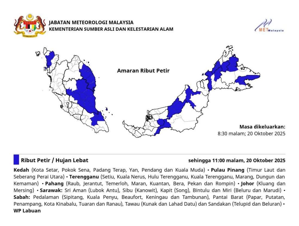 气象局发布雷暴警告,预计雪兰莪、槟城、登嘉楼、彭亨、柔佛、砂拉越、沙巴及联邦直辖区纳闽等多个地区将出现雷暴、强降雨和大风天气。受影响地区包括: