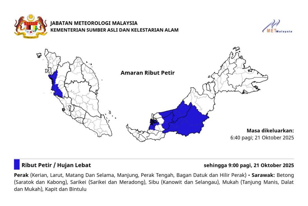 马来西亚气象局今早(10月21日,星期二)于早上6时40分发布雷暴警报,预计霹雳州多地及砂拉越部分地区将在今早9时前持续出现雷暴、豪雨及强风天气,请公众提高警惕。