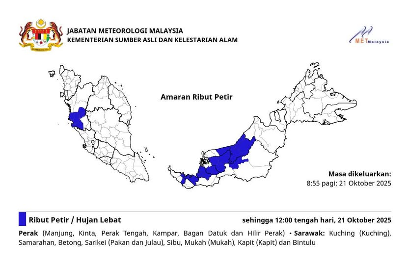 马来西亚气象局发布最新雷暴预警,预计今日(10月21日,星期二)中午12时前,霹雳州多个地区(曼绒、近打、中霹雳、金宝、峇眼拿督及下霹雳),以及砂拉越部分地区(古晋、三马拉汉、Betong、泗里街〔Pakan与Julau〕、诗巫、沐胶〔Mukah〕、加帛〔Kapit〕及民都鲁)将出现雷暴、豪雨及强风天气。