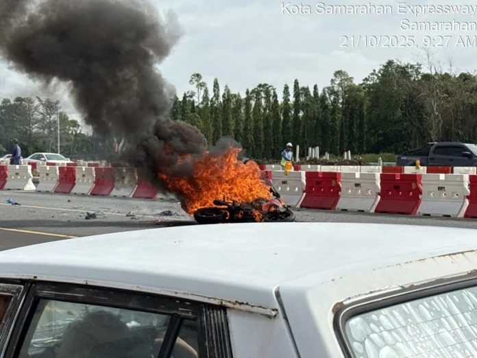 据了解,事故涉及一辆摩托车、一辆国产普腾沙嘉轿车及一辆10吨重的大罗厘。车祸冲击猛烈,摩托车被撞得变形并随即冒烟起火,现场浓烟滚滚、场面触目惊心。