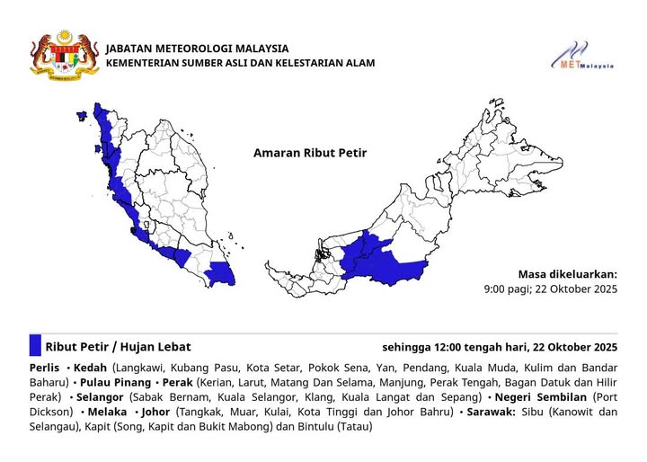 马来西亚气象局发布雷暴警报,预料今日至明日(10月22日,星期三)中午12时前,多个州属将出现雷电交加、豪雨及强风天气。