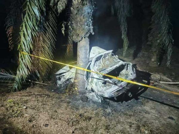 这起悲剧发生在莫哈末丹尼尔驾驶车辆时,因失控撞向路旁油棕树,导致车辆起火,二人未能及时逃生,终致丧命。