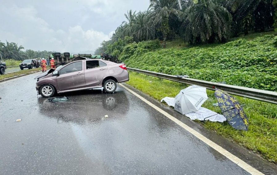这起交通事故发生在昨日上午11时44分,地点位于巴隆路段。一名24岁的轿车司机在撞上载有棕油的油罐车后,惨遭当场死亡。