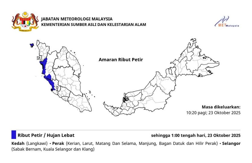 吉打(浮罗交怡)、霹雳(吉辇、拉律马登及司南马、曼绒、峇眼拿督及下霹雳)以及雪兰莪(沙白安南、瓜拉雪兰莪及巴生)地区,预计将出现雷暴、豪雨及强风,警报有效至10月23日(星期四)下午1时。