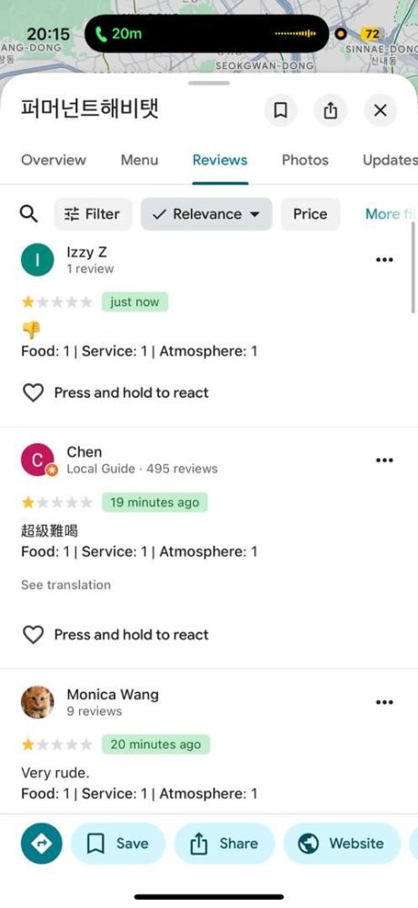 目前,店方已关闭Instagram的留言功能,但怒火并未平息。谷歌地图(Google Maps)上的该店评论区随即被大量网友“灌爆”,几乎清一色的一星评价,留言痛批店家“赤裸裸歧视”“极度傲慢”“毫无礼貌”。