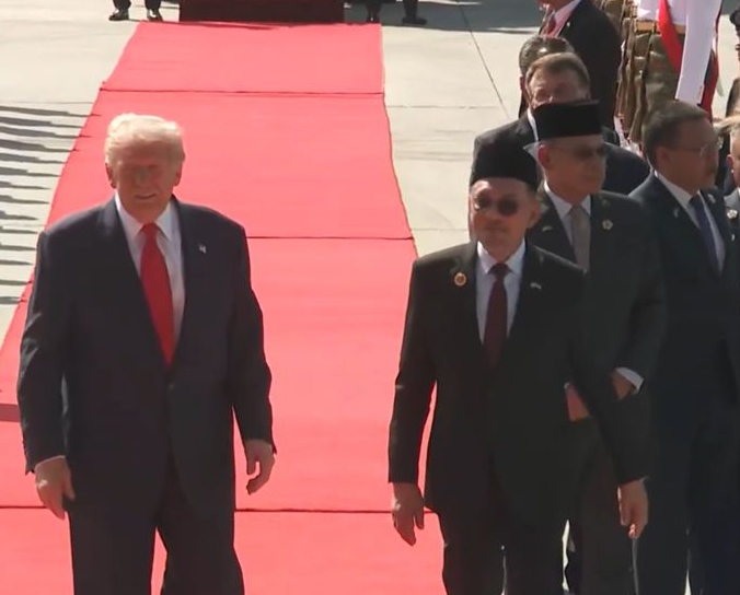 特朗普所乘坐的“空军一号”总统专机今早约10时降落于吉隆坡国际机场(KLIA)大红花贵宾厅,首相拿督斯里安华亲自到场迎接,场面隆重庄严。两人于机场贵宾厅前寒暄并握手合影,象征美马双边关系迈入新阶段。