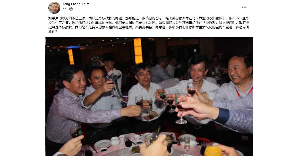 他在面子书撰文指出,在当前的政治氛围下,大多数穆斯林社会并不了解华校的生存模式与文化背景,他们关注的根本不是拨款问题,而是“酒”这一象征性的议题。