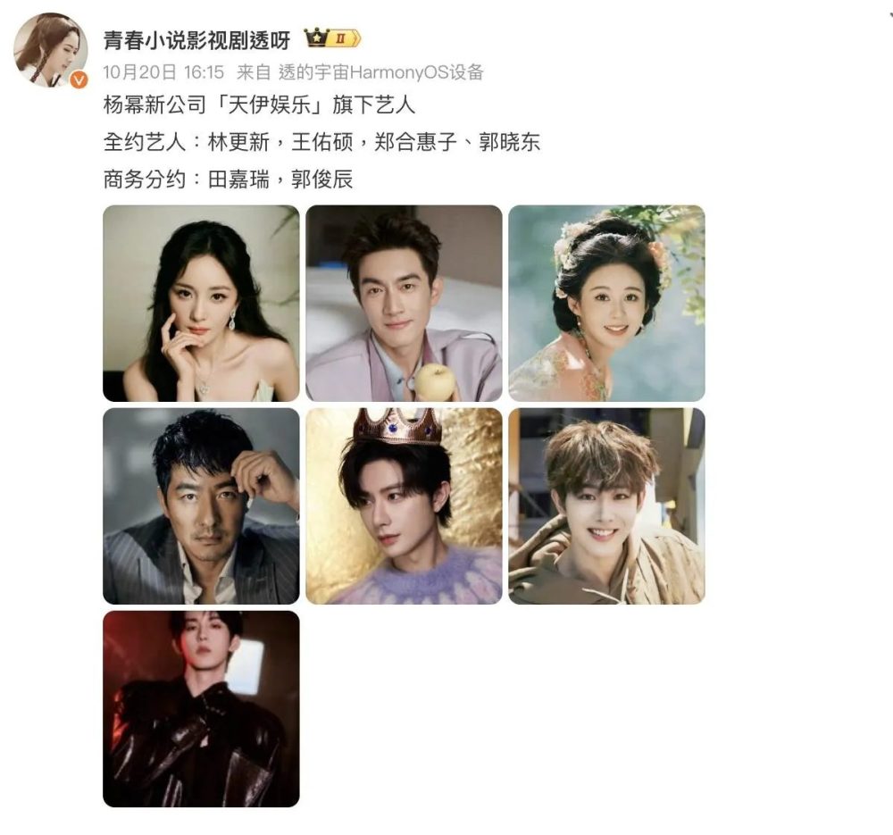如今,杨幂独立成立工作室,并与母亲创立新公司天伊娱乐,涵盖艺人经纪、影视投资等业务。网传签约名单包括林更新、王佑硕、郑合惠子、郭晓东,以及商务分约的田嘉瑞和郭俊辰。