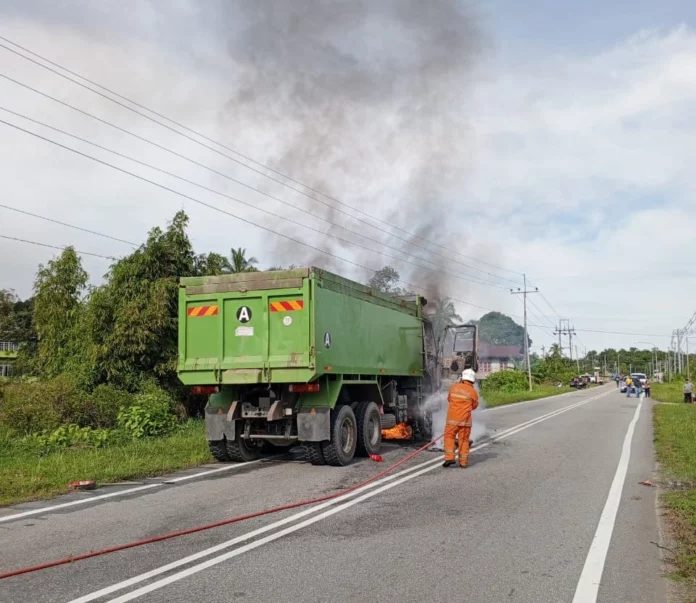 根据《诗华日报》报道诗巫26日午发生一场惊险事故,一辆载重30吨的罗里在沐胶—乌也处路甘榜朱丹路段行驶途中突发起火,火势猛烈将车头烧毁约七成,所幸司机及时逃生,无人受伤。