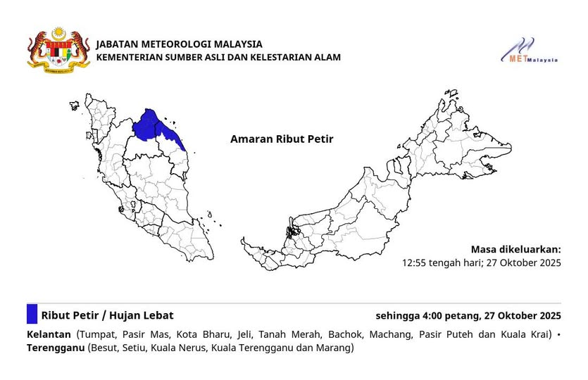 预计 Kelantan(Tumpat、Pasir Mas、Kota Bharu、Jeli、Tanah Merah、Bachok、Machang、Pasir Puteh 和 Kuala Krai)以及 Terengganu(Besut、Setiu、Kuala Nerus、Kuala Terengganu 和 Marang)将出现雷暴、大雨及强风天气,持续至2025年10月27日星期一下午4时。