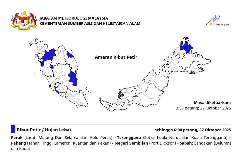 马来西亚气象局发布警告,预计今日(2025年10月27日)至下午6时,以下地区将出现雷暴、暴雨及强风:
