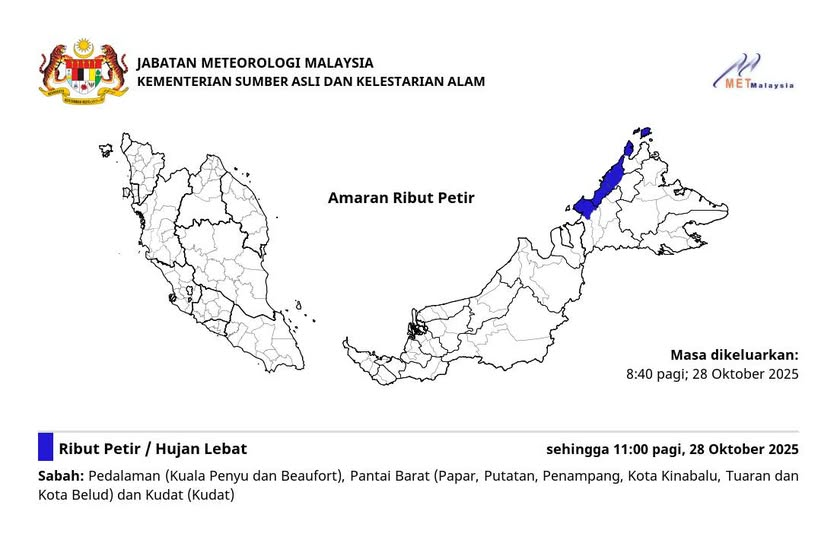 马来西亚气象局发布雷暴预警,预计沙巴多地将出现雷电交加、强风及大雨天气。受影响地区包括:内陆区(瓜拉奔尤、保佛)、西海岸区(吧巴、布达丹、兵南邦、亚庇、斗亚兰及哥打布律)以及古达地区,预警将持续至10月28日(星期二)上午11时。