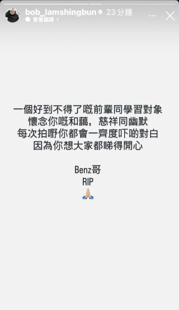 林盛斌在悼念中写道:“一个如此亲切的前辈和榜样,怀念你的和蔼、慈祥与幽默。每次拍戏你都会参与讨论对白,让大家都能开心。Benz哥,安息吧!”