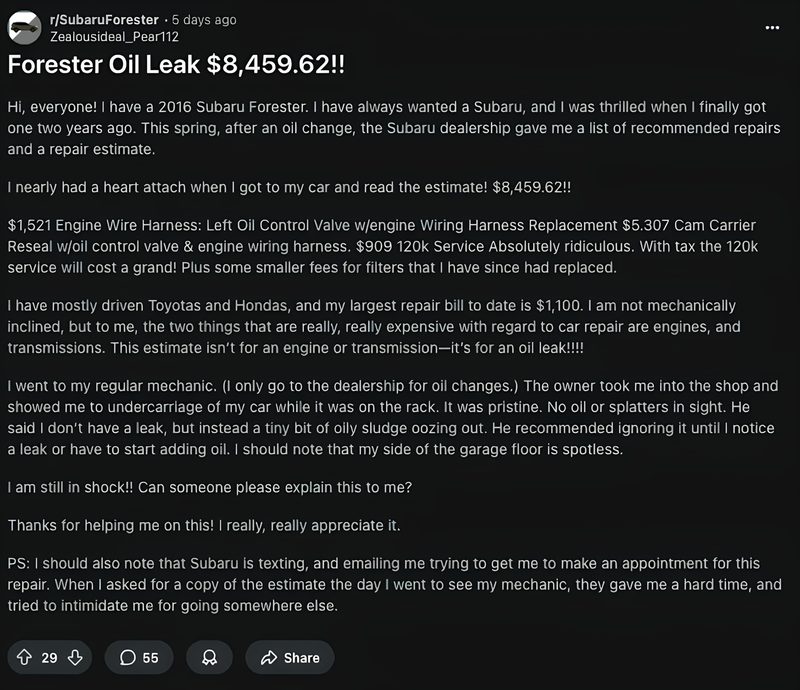 买车令人兴奋,但真正考验人性的,是保养账单。最近,一名2016年式 Subaru Forester 车主就在维修时被原厂报价吓得当场“弃车投丰田”。