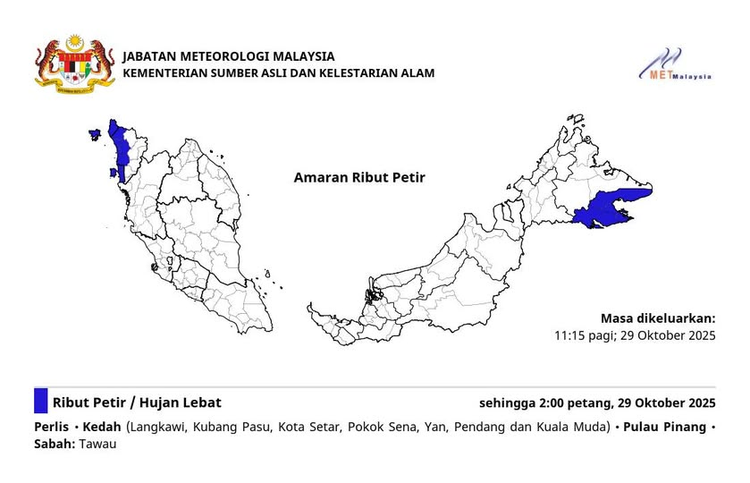 气象局预测,今日(10月29日,星期三)下午2时前,玻璃市、吉打(浮罗交怡、古邦巴素、哥打士打、莪仑、燕、笨筒及居林母打)、槟城及沙巴斗湖地区将迎来强烈雷暴、豪雨及强风天气。
