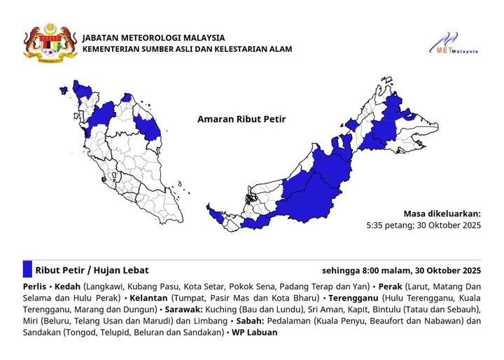 气象局发布警报,预计截至 2025年10月30日(星期四)晚上8时,以下地区将出现雷暴、豪雨及强风天气: