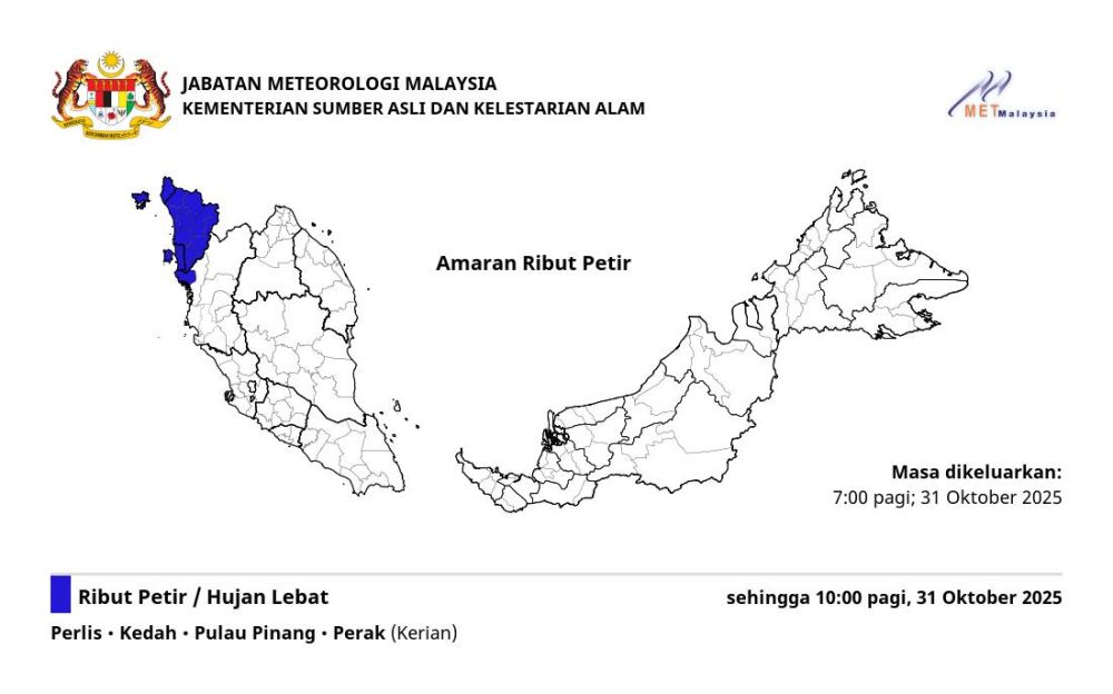 气象局发布雷暴预警,警告霹雳州(Kerian)、玻璃市、吉打及槟城等地区,预计今早将出现雷暴、豪雨及强风天气,预料恶劣天气将持续至10月31日(星期五)上午10时。