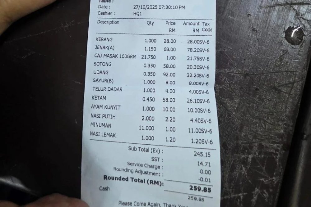 根据脸书专页“Diari Melaka”分享,这名食客于本月27日光顾该餐馆用餐,结账时服务员递上手写账单,金额为325令吉。但当他要求提供正式打印收据后,金额竟骤降至259令吉85仙,价差高达66令吉。更令他惊讶的是,打印收据中已包含销售与服务税(SST)。