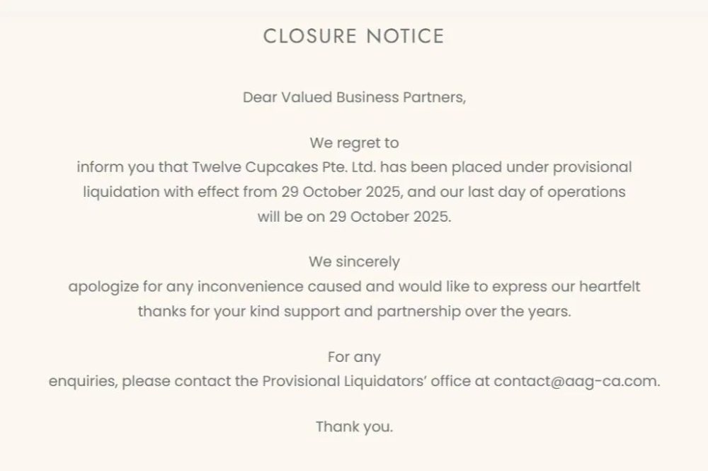Twelve Cupcakes官网确认,公司已在29日正式申请清盘,并向顾客致歉,感谢多年支持,但 未说明清盘原因。该品牌在新加坡共拥有 20家门店。