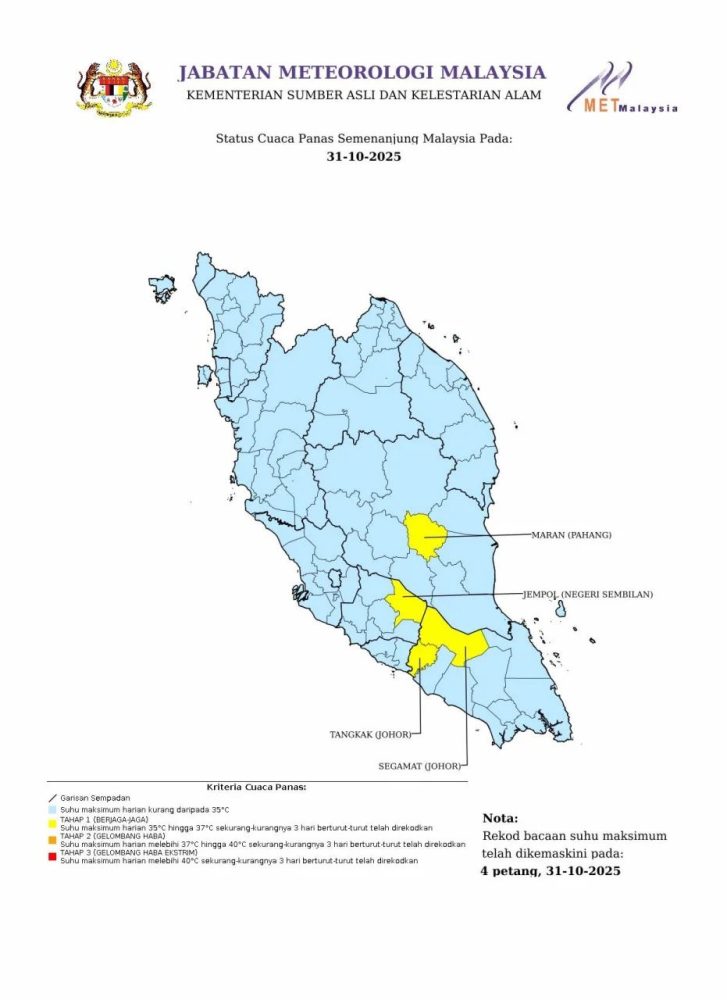首页 时事 气象预报 高温警报 4地连日飙升至35-37°C气象预报高温警报 4地连日飙升至35-37°C 2025年10月31日发布日期:2025年10月31日下午4:00🔸 马来半岛共有4个地区处于一级(注意)高温状态:彭亨州马兰、森美兰州仁保,以及柔佛州丹绒马和昔加末。Advertisement 📌 注意事项:连续至少3天,日最高气温将达到35-37°C,请民众适当防暑降温。