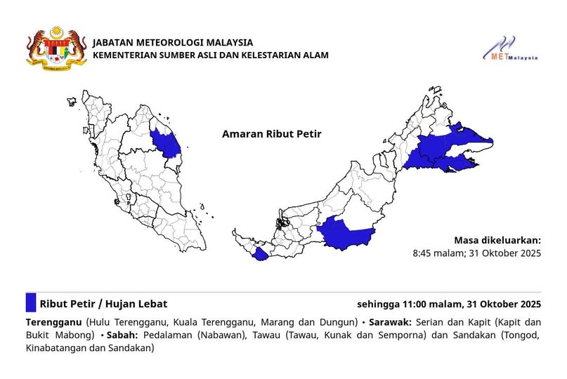 预计强雷暴、大雨及强风将影响以下地区至2025年10月31日晚上11点: