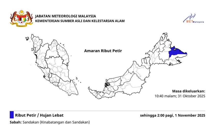 沙巴州部分地区——山打根(包括京那巴丹岸与山打根县)今晚将出现雷暴、豪雨及强风天气,预计持续至11月1日(星期六)凌晨2时。