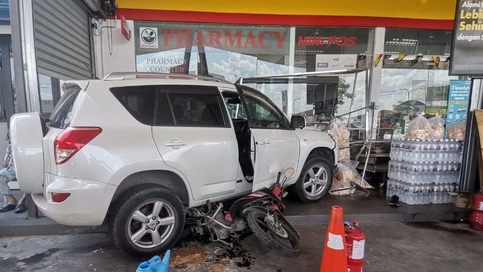 砂拉越诗巫今日中午约12时,诗巫敦阿末再迪艾德鲁斯路一座加油站发生一起惊险意外,一辆轿车突然失控暴冲,撞上正准备离开的摩托车,导致一名年约60岁的女骑士被卷入车底,脚部重创送院。