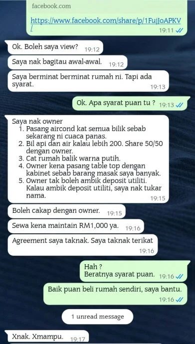 - 还要求租金固定为每月1000令吉,并拒绝签署租约,因为不想受条款束缚。