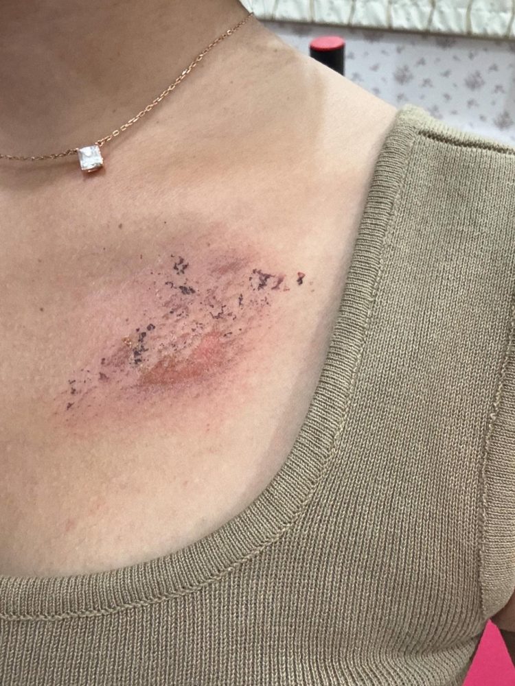 万圣节装扮变灾难!一名女子为了扮造血迹效果,在锁骨贴上纹身贴纸,事后想清除时误信网传偏方,用所谓的“清洁神器”——科技海绵擦拭皮肤。没想到才搓几下,皮肤立刻传来剧烈灼痛,最终整片皮肤破皮溃烂,惨不忍睹。