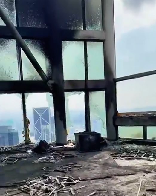 根据社交媒体流传的视频,事发地点疑为大厦第57层的空中餐厅露台。火势扑灭后,原本高雅的用餐区化为焦黑废墟,木制桌椅全数烧成炭灰,玻璃窗被高温熔化,碎片散落一地,吧台表面被浓烟熏黑,满目疮痍。