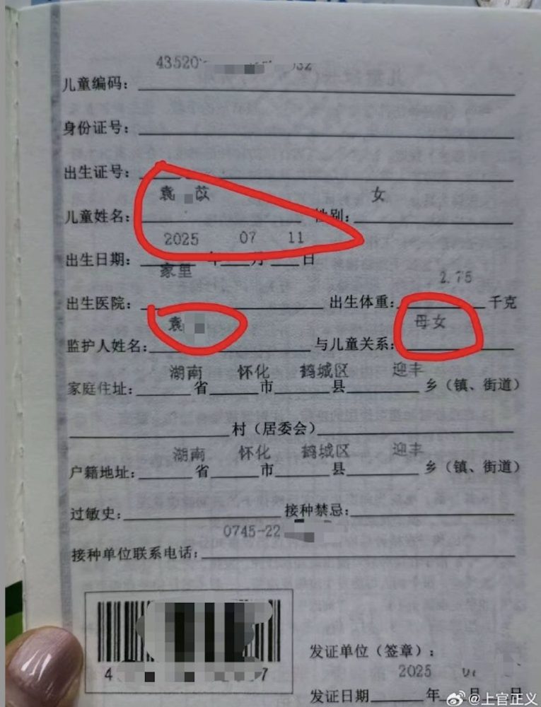 上官正义披露的多个案例显示,一名来自云南昭通的18岁产妇,在怀化生产后女婴被袁女冒名登记;另一名来自内蒙古的少女产下的婴儿,被登记为袁女的“女儿”,甚至连户口与出生日期都被篡改。袁女还自称“有渠道能买到医院的出生证明”,能“洗白”婴儿身份。