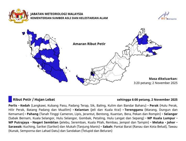 大马气象局发布最新雷暴警报,预计至2025年11月2日(星期日)傍晚6时前,多个州属将持续出现雷暴、豪雨及强风天气